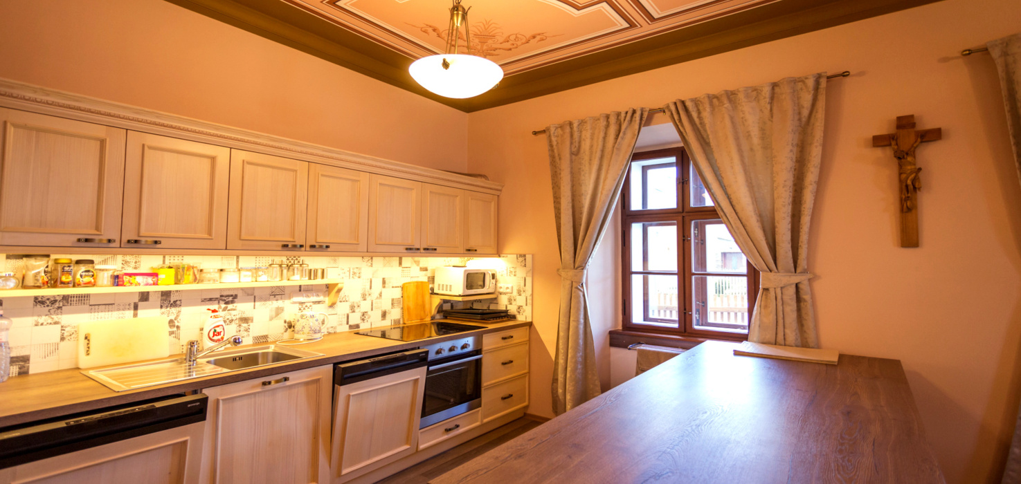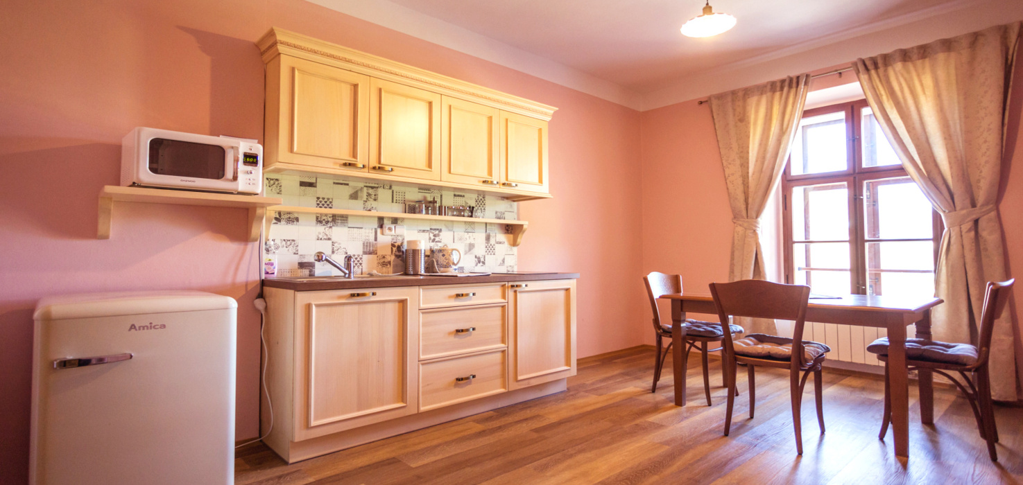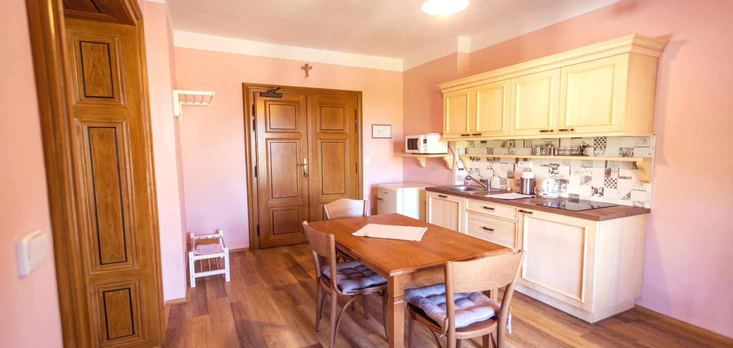 4 Apartmány – každý partmán má samostatnou vybavené kuchyňku s posezením a samostatnou koupelnu s toaletou.