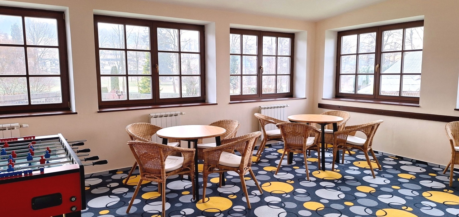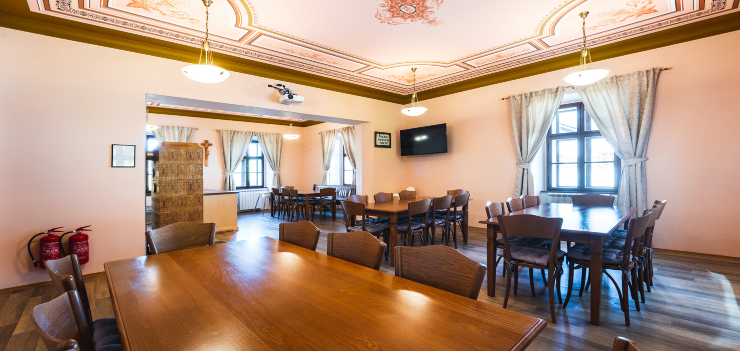 Užijte si posezení ve společenské místnosti v zámeckém stylu, která má i data projektor.